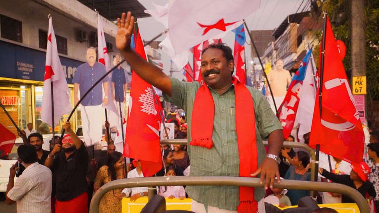 തുറന്ന വാഹനത്തിൽ സ്ഥാനാർഥി പ്രവർത്തകരെ അഭിവാദ്യം ചെയ്തു.